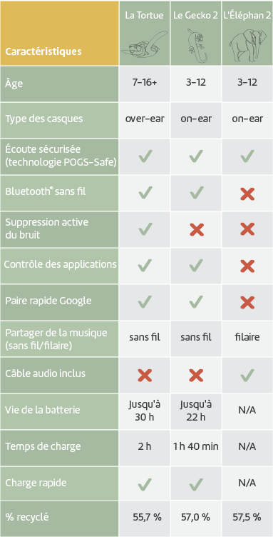 Un excellent casque filaire pour enfants sûr, solide et doté de fonctionnalités amusantes et confortables. Nous l’avons appelé « L’Éléphant », car la connexion filaire te fait rester au sol, comme un éléphant. Comme un éléphant, le casque POGS « L’Éléphant » a une texture ridée qui ressemble à la peau d’un éléphant ainsi qu’une longue durée de vie. Le câble QuickSafe, avec microphone intégré, et le câble POGLink sont fourni. Ces câbles textiles ne s'emmêlent pas.
